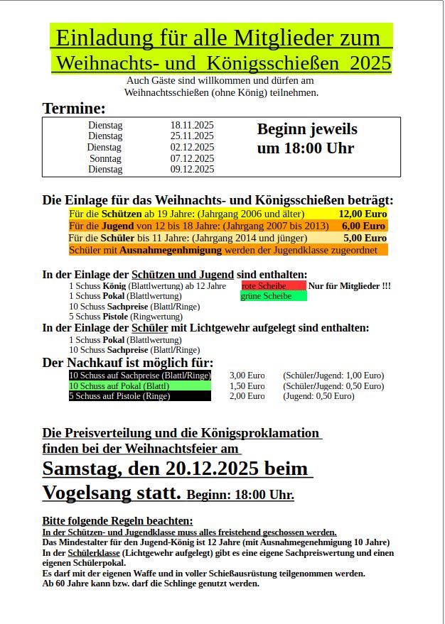 =============================================================== Einladung zum Weihnachtsschießen Übungs- und Trainingsmöglichkeiten bestehen am Dienstag, den 04.11.2025 am Dienstag, den 11.11.2025 jeweils ab 19:00 Uhr =============================================================== Ergebnis vom Kirchweihschießen Weitere Fotos sind ín der Bildergalerie =============================================================== Bilder vom (Radl)-Ausflug sind in der Bildergalerie ![]() =============================================================== Gaurundenwettkämpfe 2025/2026 Die Termine und die Ergebnisse der Rundenwettkämpfe sind in der Schützenzeitung abrufbar. =============================================================== Unsere Könige 2025 ![]() Unsere neuen Ehrenmitglieder ![]() =============================================================== Die neu gewählte Vorstandschaft vom Oktober 2024 ![]() (Lara Fleischer fehlt auf dem Bild) Weitere Fotos sind in der Bildergalerie =============================================================== |
