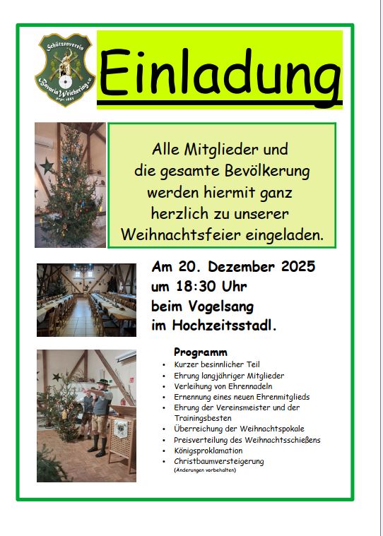 =============================================================== Einladung zur Weihnachtsfeier =============================================================== Ergebnis vom Kirchweihschießen Weitere Fotos sind ín der Bildergalerie =============================================================== Bilder vom (Radl)-Ausflug sind in der Bildergalerie ![]() =============================================================== Gaurundenwettkämpfe 2025/2026 Die Termine und die Ergebnisse der Rundenwettkämpfe sind in der Schützenzeitung abrufbar. =============================================================== Unsere Könige 2025 ![]() Unsere neuen Ehrenmitglieder ![]() =============================================================== Die neu gewählte Vorstandschaft vom Oktober 2024 ![]() (Lara Fleischer fehlt auf dem Bild) Weitere Fotos sind in der Bildergalerie =============================================================== |