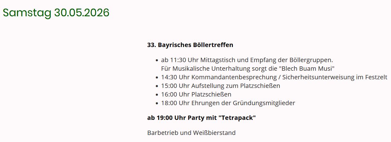 =============================================================== Das Dorfmoastaschießen startet wieder im Mai 2026 Unsere Trainingstage im April können zum Üben genutzt werden: 14.04. / 21.04. / 28.04. jeweils ab 19:00 Uhr =============================================================== Ergebnisse =============================================================== Fotos vom Sauschießen sind in der Bildergalerie =============================================================== Fotos vom Faschingsball sind in der Bildergalerie =============================================================== Neujahrsböllern am 1.1.2026 ![]() Weitere Fotos sind in der Bildergalerie =============================================================== Unser neues Ehrenmitglied ![]() Unsere Könige für 2026 ![]() Bericht von der Weihnachtsfeier Weitere Fotos sind in der Bildergalerie =============================================================== Gaurundenwettkämpfe 2025/2026 Die Termine und die Ergebnisse der Rundenwettkämpfe sind in der Schützenzeitung abrufbar. =============================================================== |